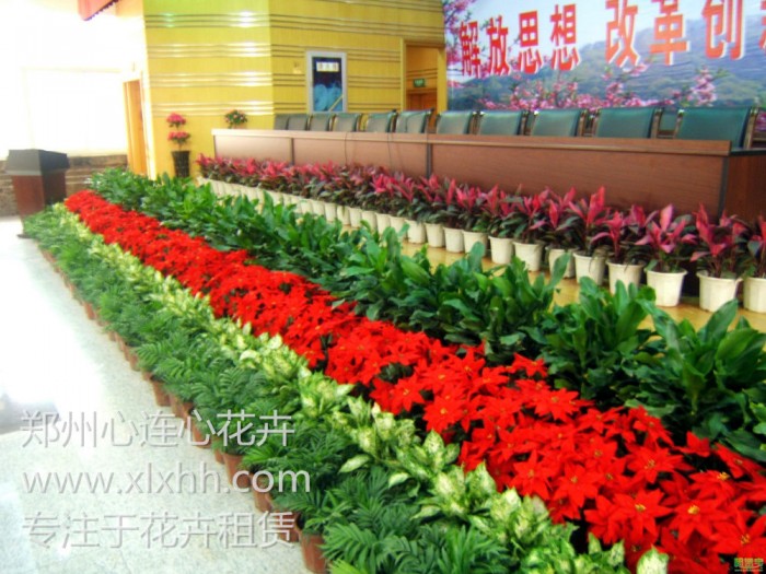 在背景處或角落處可以選擇較高且大方的花卉植物,如散尾葵、大葉傘等。如果是主席臺式的可以在主席臺前擺放2-4層(依你的會場大小而定)花卉,最里面的要以綠色或花葉為主的植物擺放,且高度在這2-3層中最高,但也不能高于主席臺的高度,一般以相等為宜。第二層可以選擇開花的花卉植物,如紅掌、彩色馬蹄蓮、鳳梨等,高度比第一層要稍矮,最外面的一層可以選擇開花的或是常綠的相對較矮的即可,作為外面圍邊用的一定要豐滿,這樣布置后既大方又漂亮,適宜大型的會議。如果主席臺的桌面比較寬或有空間,可以考慮用切花插幾個插花組件,擺放于主席臺的桌上。